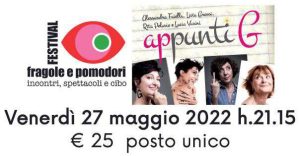 Nell’ambito del “FESTIVAL FRAGOLE E POMODORI”, indetto da Me.Dea., con la partecipazione della nostra Associazione, segnaliamo lo spettacolo “appunti G” a cura di Alessandra Faiella, Livia Grossi, Rita Pelusio e Lucia Vasini, che si terrà il giorno 27 maggio alle ore 21.15 presso il Teatro Sociale di Valenza.