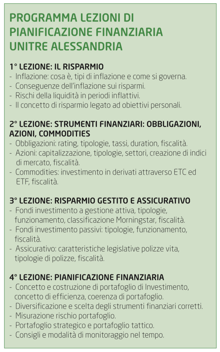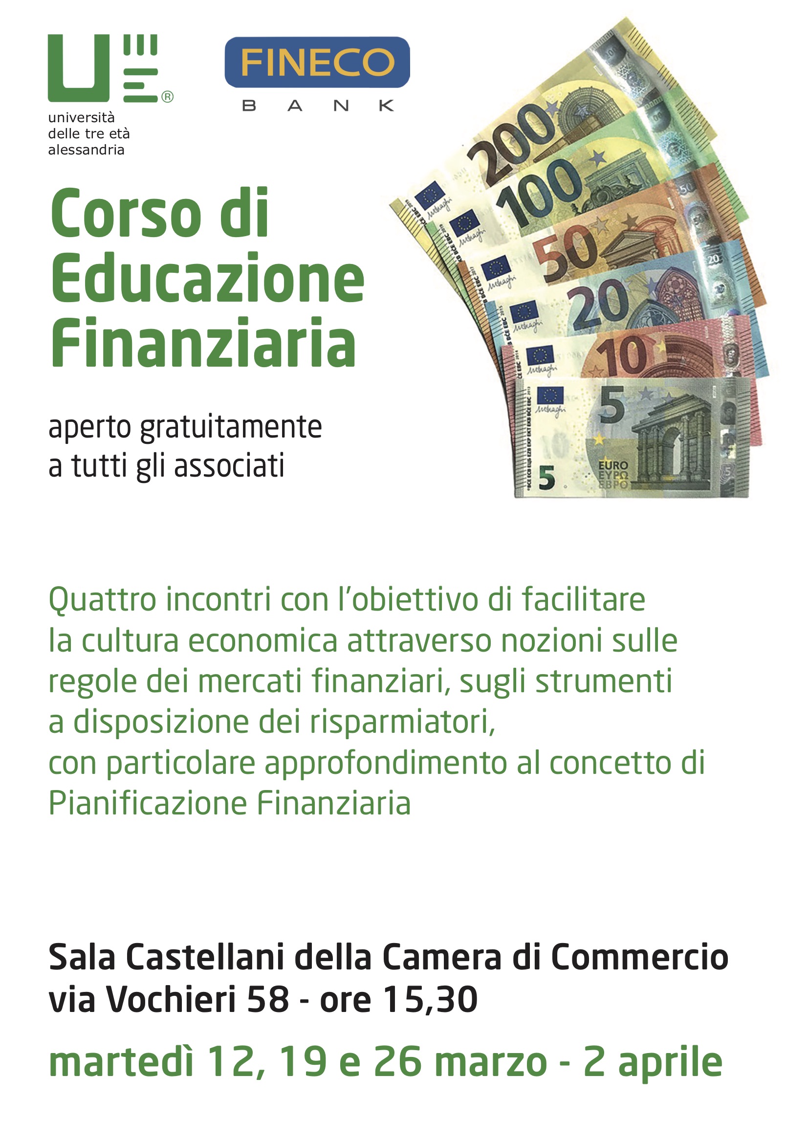 Una importante iniziativa promossa da Unitre di Alessandria e Banca FINECO, nell’ambito del progetto “l’Educazione Finanziaria Nazionale” e aperta ai Soci con lo scopo di facilitare la cultura economica attraverso nozioni sulle regole dei mercati finanziari, sugli strumenti a disposizione dei risparmiatori, con particolare approfondimento al concetto di Pianificazione Finanziaria. Il corso (della durata di 4 incontri) si terrà a marzo nei giorni di martedì presso  i locali della CCIAA di Alessandria – Via Vochieri sala Castellani.
